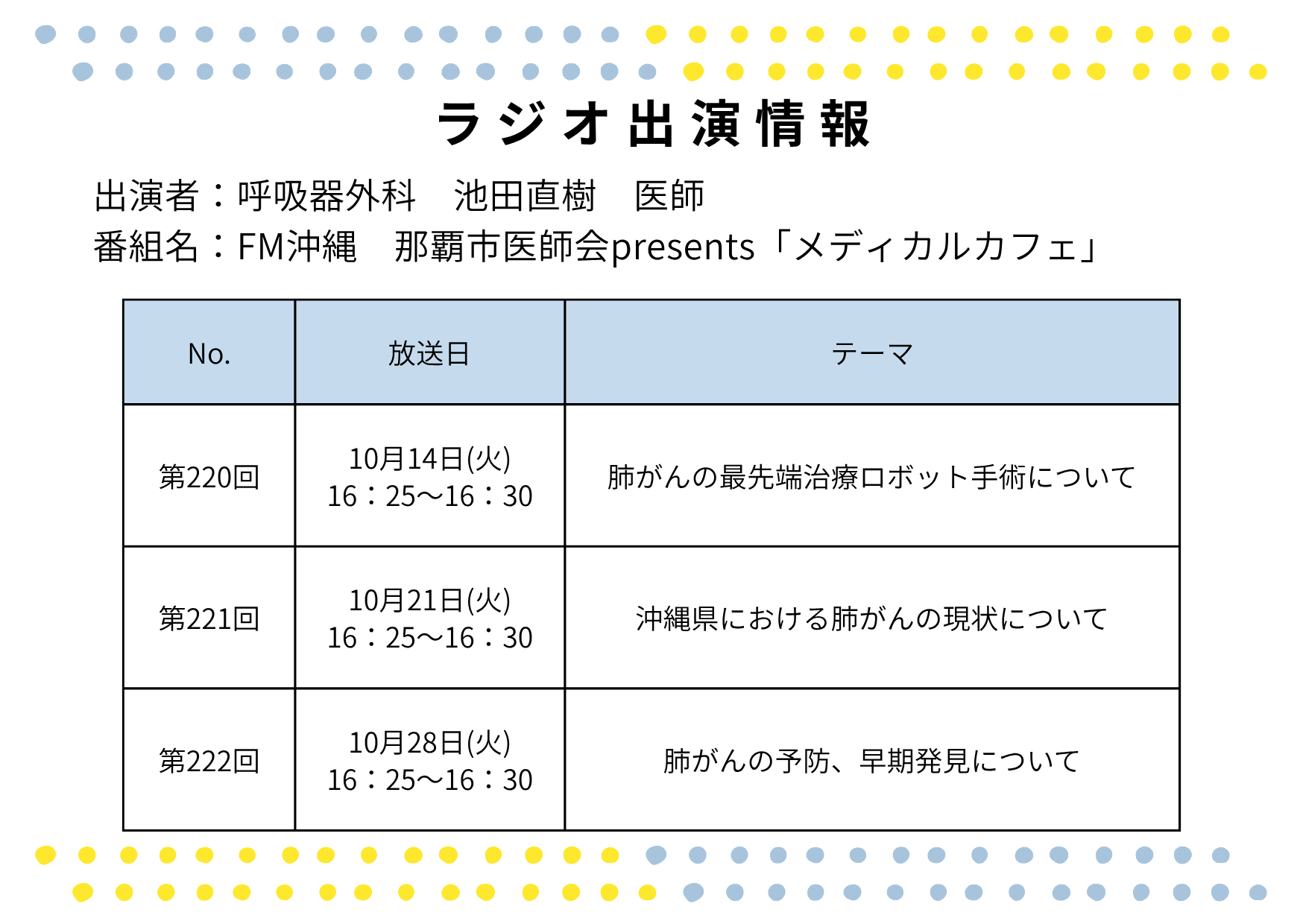 呼吸器外科 池田医師がラジオ番組に出演します。