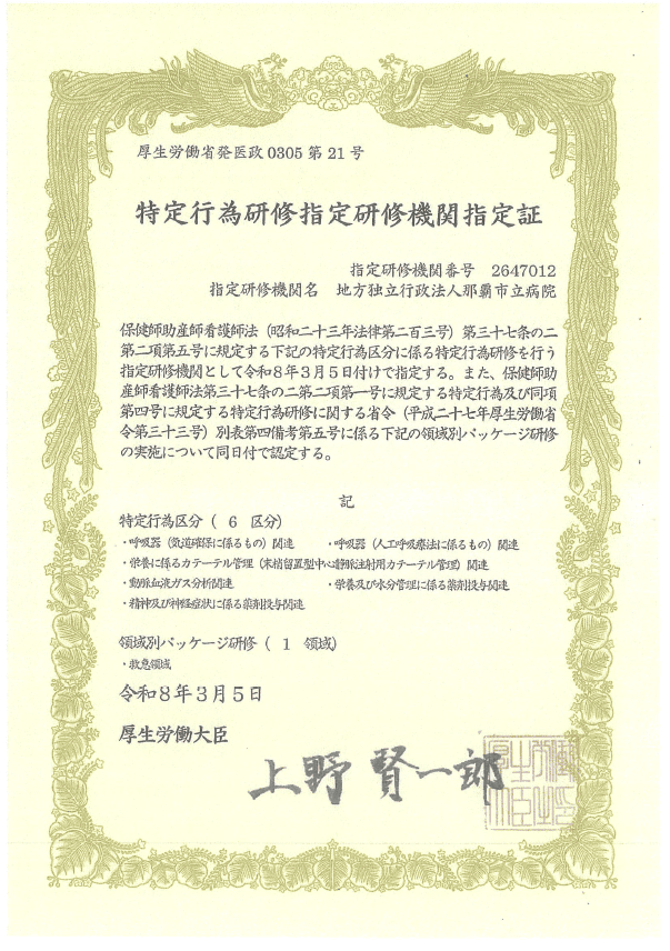当院は2026年3月に特定行為研修指定研修機関の指定を受け、4月より看護師特定行為研修を開講します。